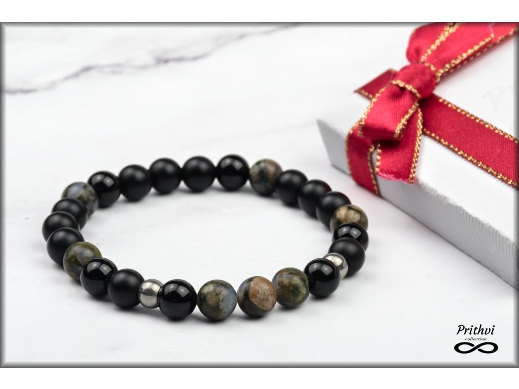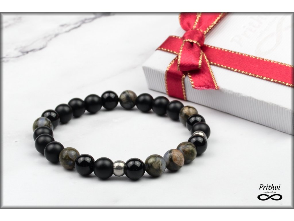 Športovo - elegantný pánsky náramok vyrobený z dúhového opálu, matného a lesklého ónyxu, doladený doplnkom z chirurgickej ocele.