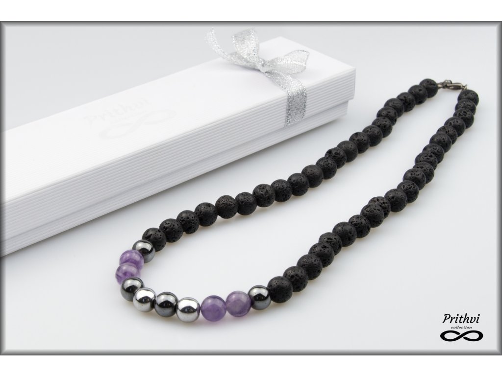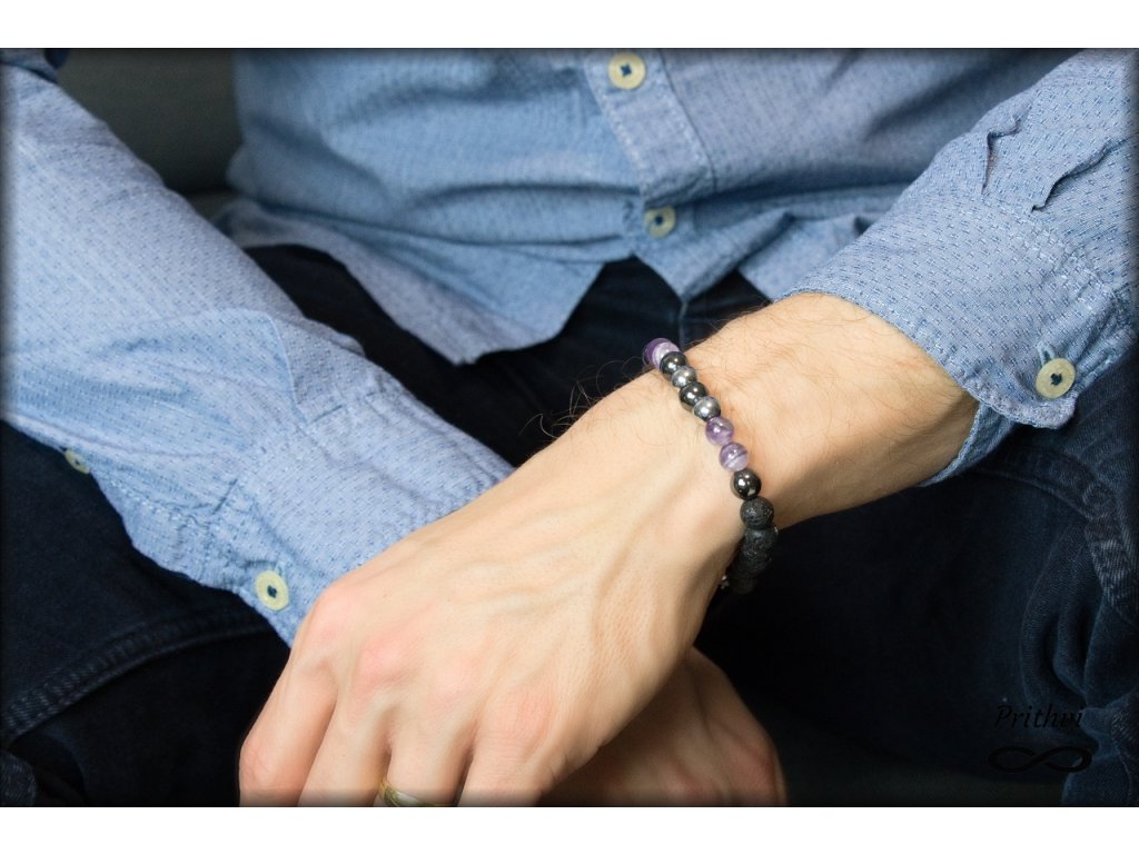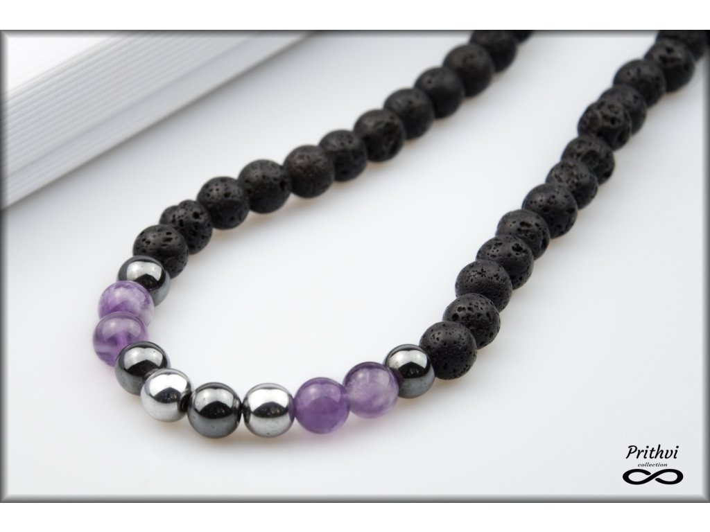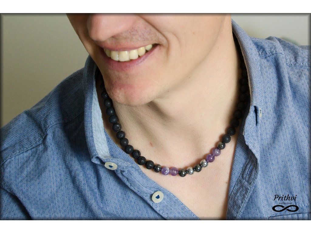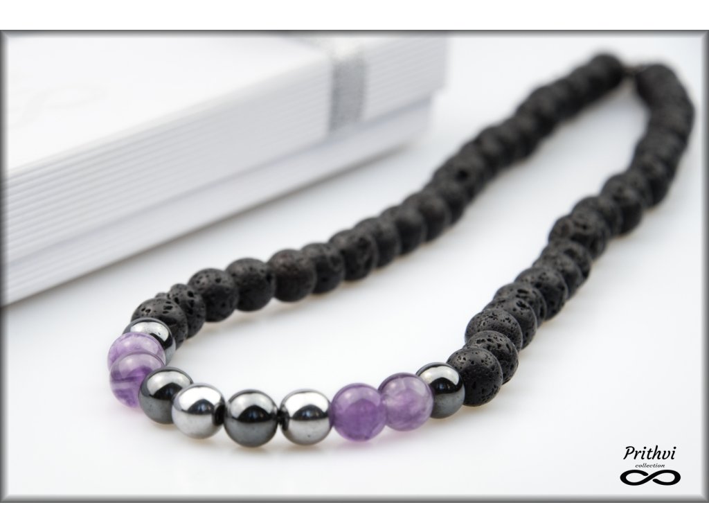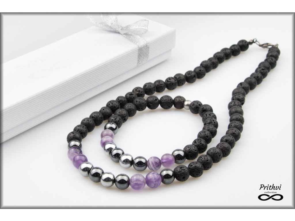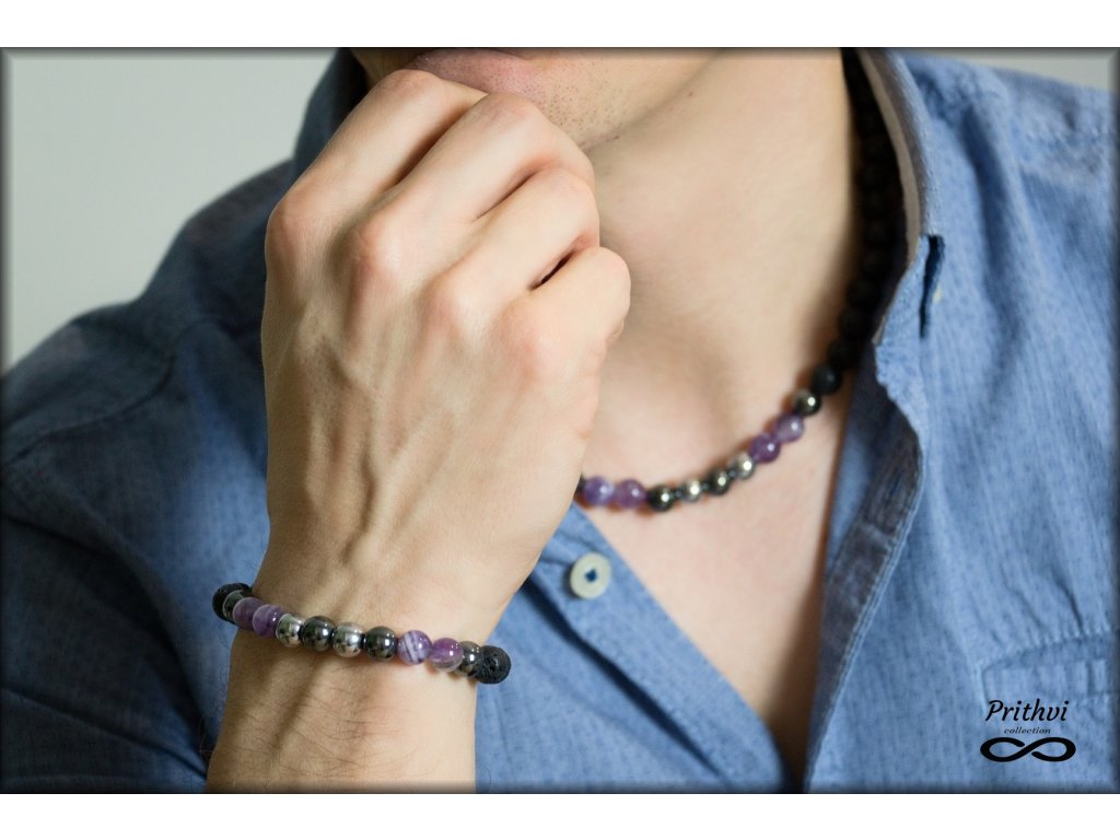 Krásny a elegantný pánsky náramok a náhrdelník vyrobený z lávového kameňa, hematitu a ametystu je symbolom odvahy, energie a skrytej vnútornej sily.