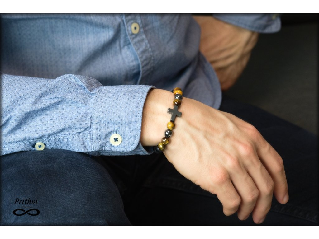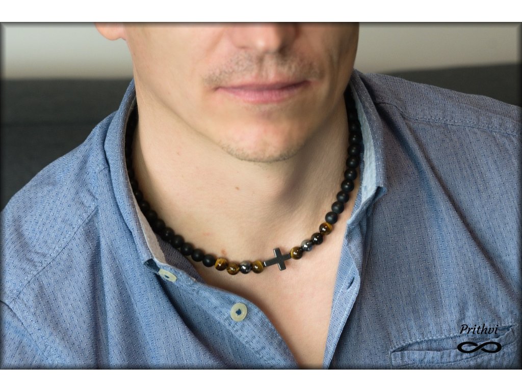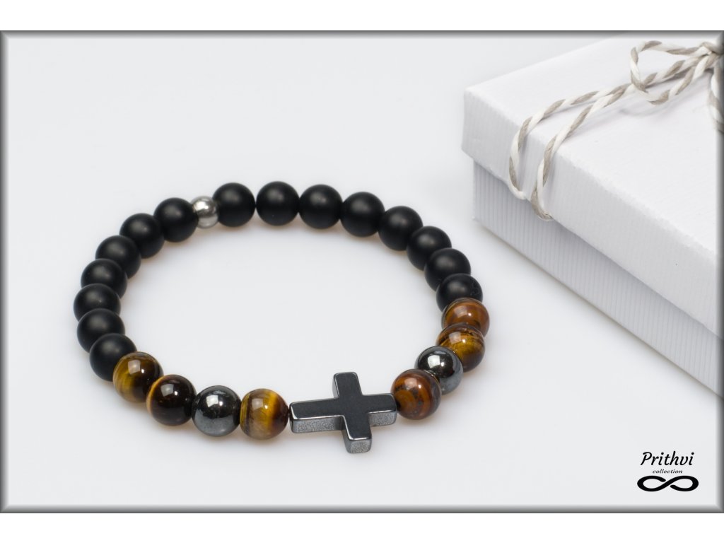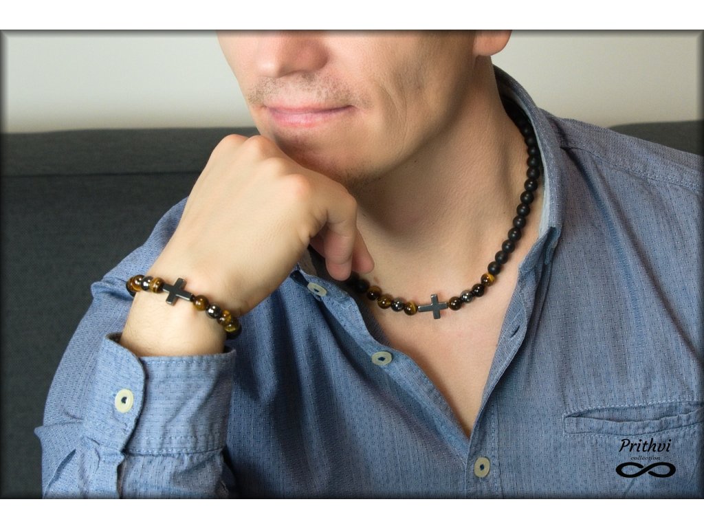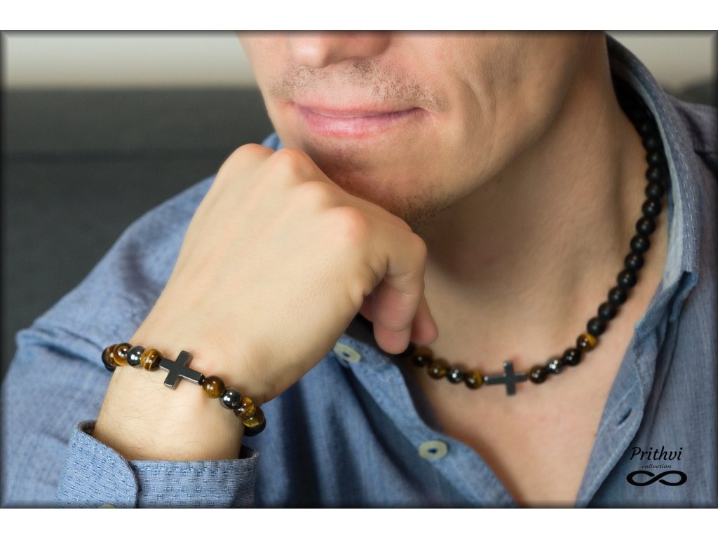 Pánsky náramok a náhrdelník - znamenie Býk je vyrobený z tigrieho oka, ónyxu a hematitu, doladený veľkým krížom z hematitu a ukončením z chirurgickej ocele.
