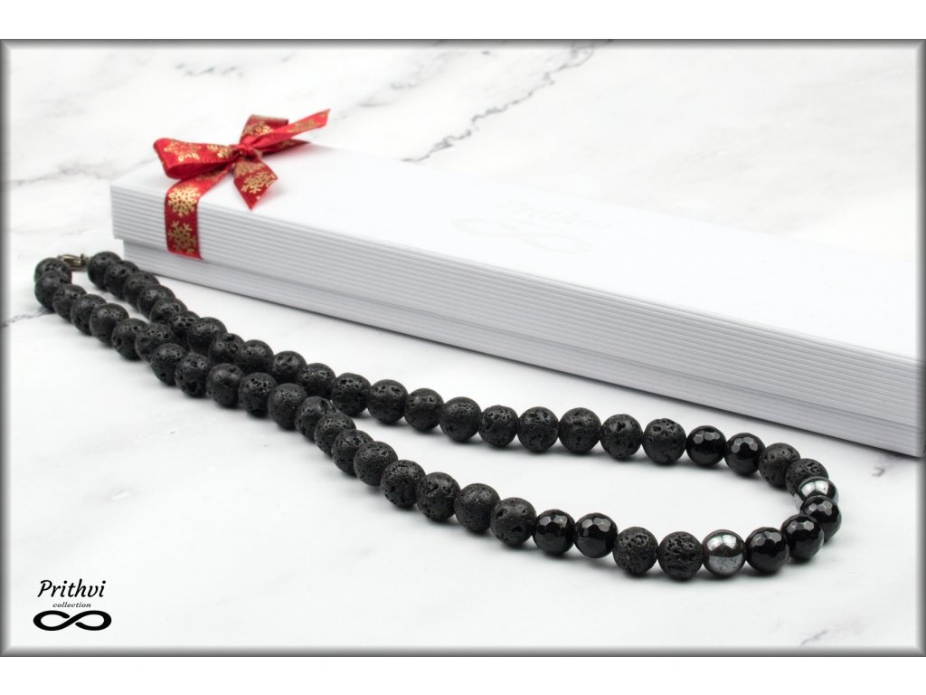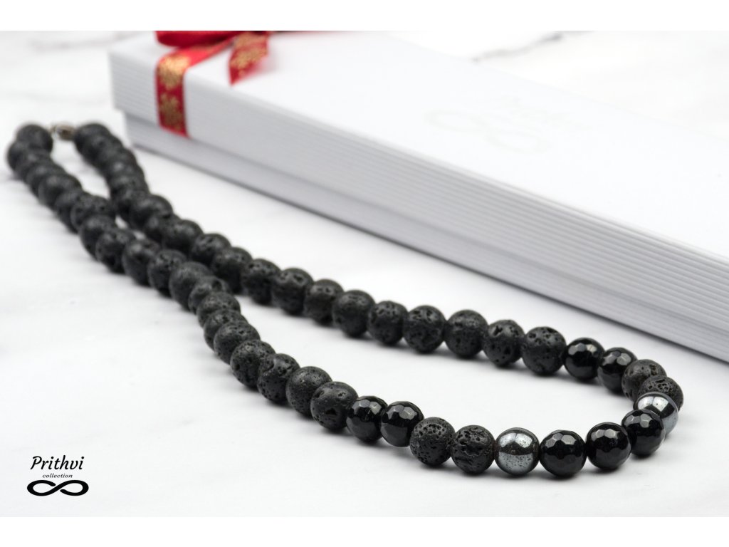Športovo elegantný pánsky set náramku a náhrdelníka vyrobený zo sardonyxu, hematitu a lávového kameňa v 8mm prevedení, na posilnenie pevnej vôle a charakteru. Náramok je doladený doplnkom z chirurgickej ocele.